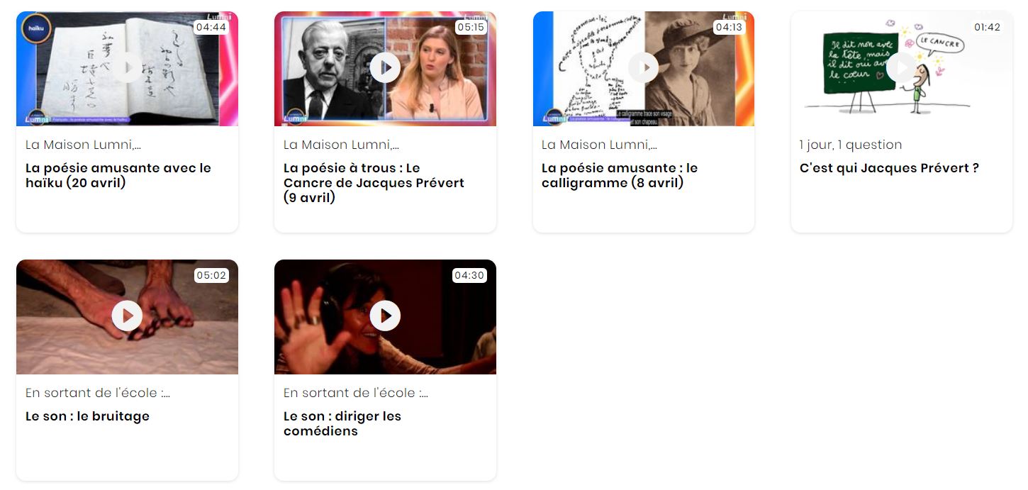 - La collection « En sortant de l’école » propose des courts métrages animés qui associent l’univers graphique de jeunes réalisateurs aux poèmes de Jacques Prévert, Robert Desnos, Guillaume Apollinaire, Claude Roy…