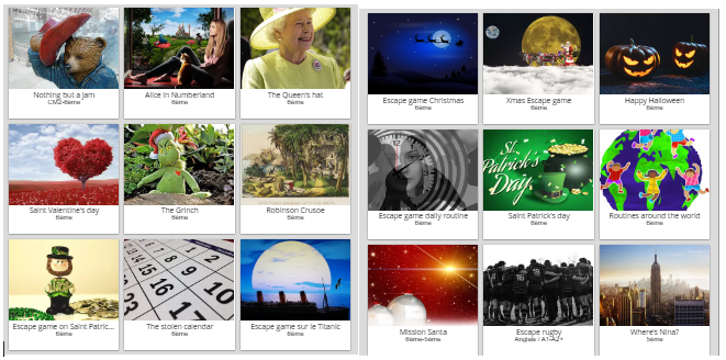 Vous trouverez par exemple une page anglais avec des jeux d’évasion classés par niveau (collège).