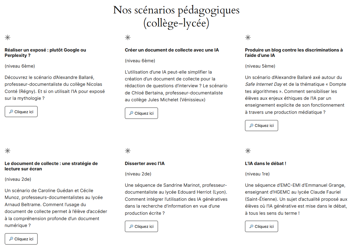 Les scénarios pédagogiques concernent le collège et le lycée et soulignent aussi l’importance du travail collaboratif et d’un enseignement explicite.