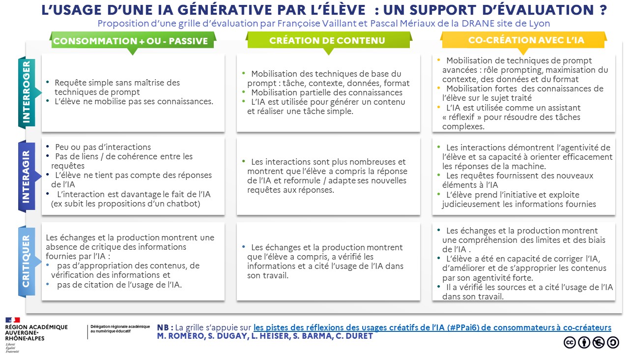 Vous trouverez sur le site de laDRANE, une proposition de grille d’évaluation : Evaluer les usages des élèves d’une IA Générative élaborée par Françoise Vaillant et Pascal Mériaux.