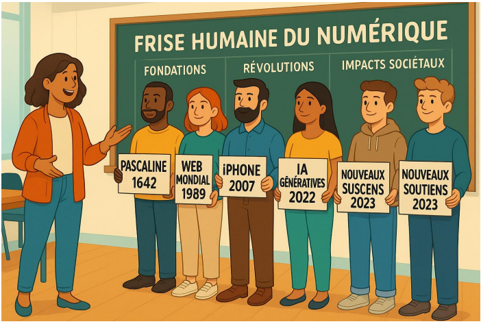 Cette activité pédagogique déconnectée permet de contextualiser le numérique et les IA dans le temps long ! : https://drane.edu.ac-lyon.fr/spip/La-frise-humaine-du-numerique-et
